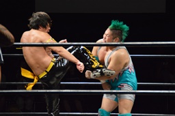 先発はKUDOと樋口。KUDOローキック(右写真)3発。