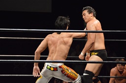 竹下も逆水平(左写真)、打ち合いに。