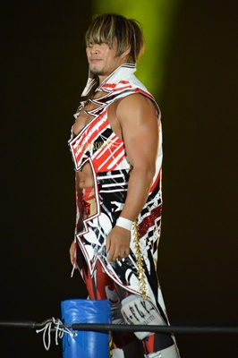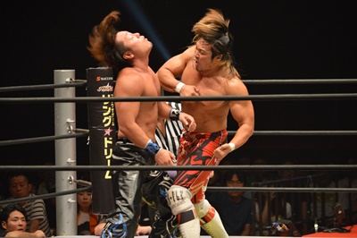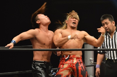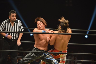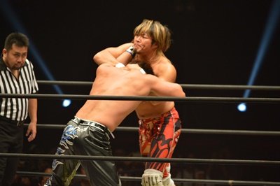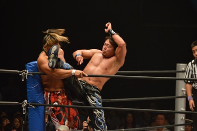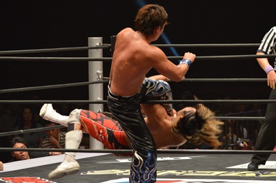 さらに正調蒼魔刀狙うが棚橋はカウンターのスリングブレイド(左写真)、ダブルダウン。