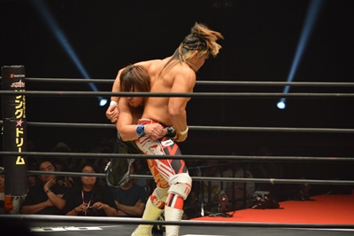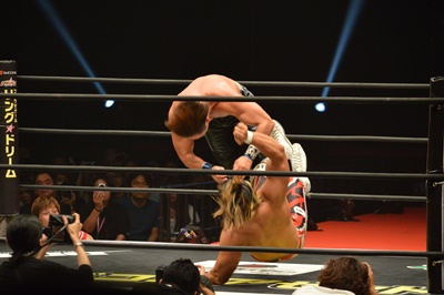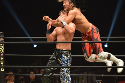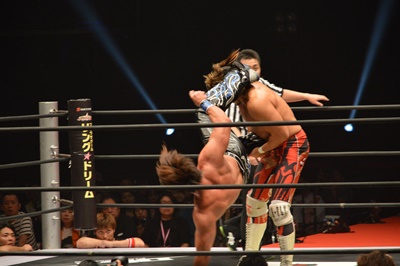 棚橋また足を取る、HARASHIMAはキャッチ延髄(左写真)。