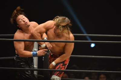 棚橋ロープに押し込む、クリーンブレーク(左写真)。