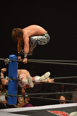 HARASHIMAをコーナーに振って突っ込む、HARASHIMAカウンターのキックから正面跳びドロップキック(左写真)。