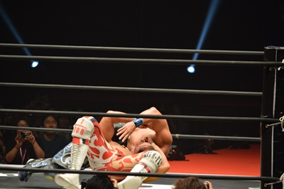 ハンマーロック(右写真)からヘッドロック、フライングメイヤー、棚橋ヘッドシザーズで返す。