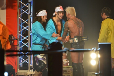 飯伏と坂口、新王者同士が握手(右写真)。