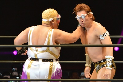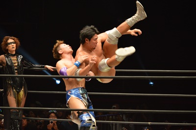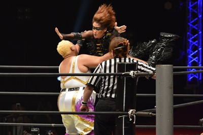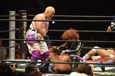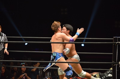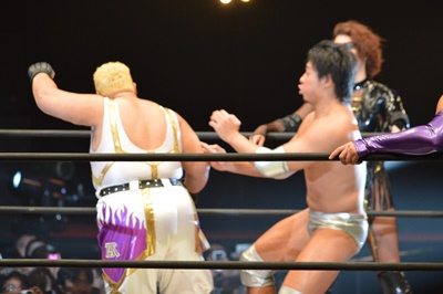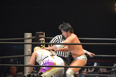 平田のエルボーが大鷲に誤爆(右写真)、大鷲OTRしかかるがなんとかロープに引っかかる。