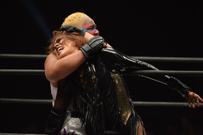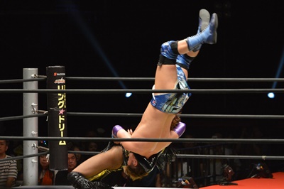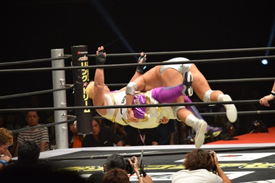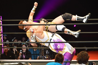 LiLiCoがアジャにコーナーからダイビングクロスボディ(右写真)、