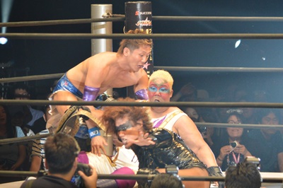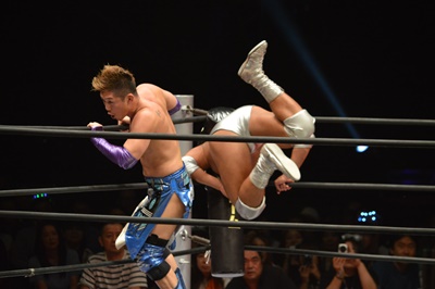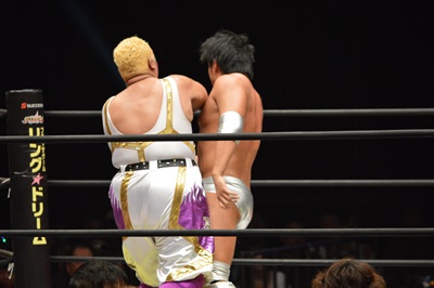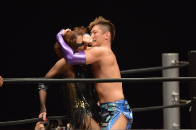 ロープ越しのスリーパー(左写真)、大石にタッチ。