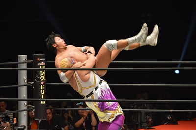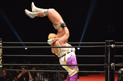 大石にフライングバックエルボー(左写真)、スパインバスター、