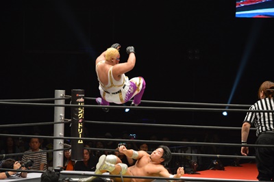 コーナーに上ってダイビングエルボードロップ(左写真)、宮武かわす。
