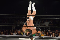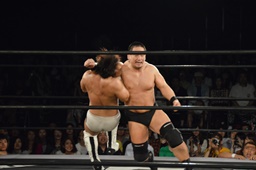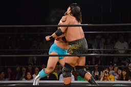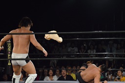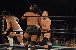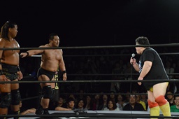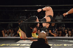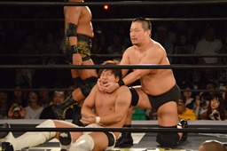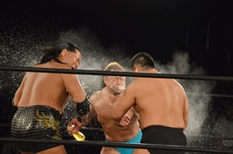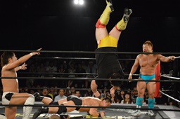 高木ボディスラムからエルボードロップ(右写真)、カウント2。大鷲にタッチ。