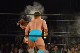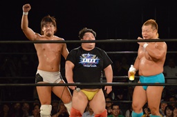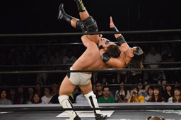 大鷲ラリアット、岩崎かわしバックドロップ(右写真)、松永にタッチ。