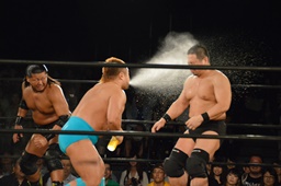 松永大鷲にお茶ミスト攻撃(左写真)。