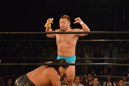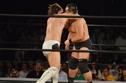 岩崎大鷲にチョップ(左写真)、エルボー、