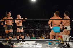 大鷲と松永ラリアットの打ち合い(左写真)、両軍タッチ。5分経過。