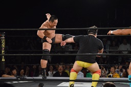 岩崎にダブルのガットショットからダブルのドロップキック(左写真)。