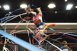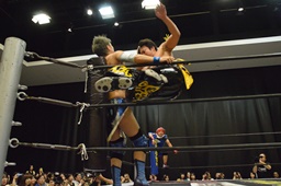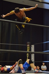 ミラクルエクスタシー(左写真)、勝俣がコーナーに上るがムーンサルトプレスは梅田が阻止。