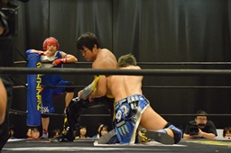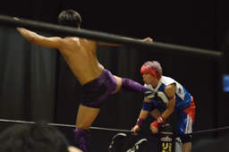 梅田ミドルキック(左写真)。梅田ロープに飛ぶ、勝俣低空ドロップキック、大石にタッチ。