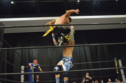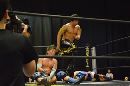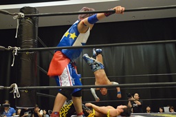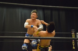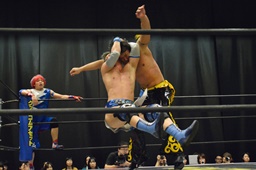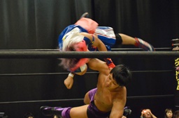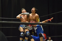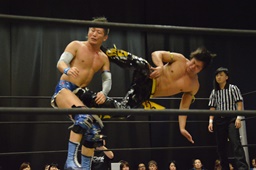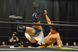 大石フライングメイヤー、KUDOヘッドシザーズ(左写真)、ブレーク。両軍タッチ。