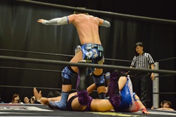 KUDOダイビングダブルニードロップ(左写真)、カウント3。