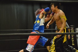 勝俣エルボー(左写真)、KUDOミドルキック、勝俣場外転落。