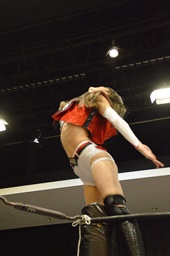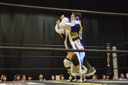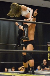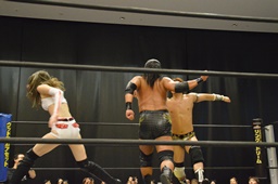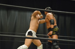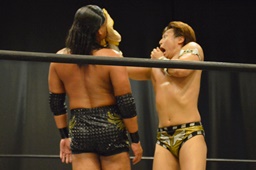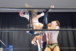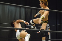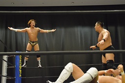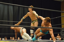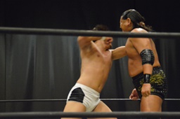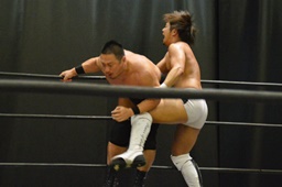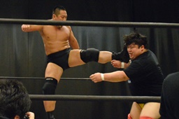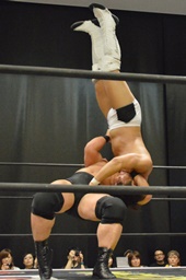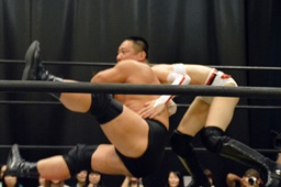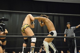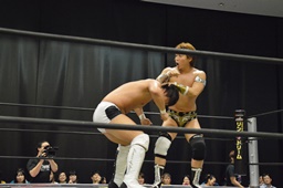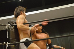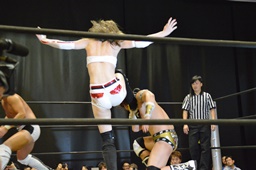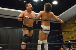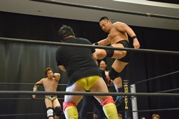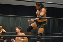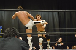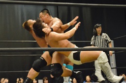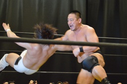 逆水平(右写真)、対角線コーナーに振って串刺しラリアット、岩崎かわしてロープに飛ぶ、大鷲カウンターのビッグブーツ。