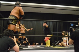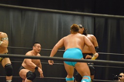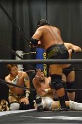 大鷲逆水平(右写真)、コーナーで踏みつけ、高木にタッチ。高木ボディスラムからニースタンプ、カウント2。平田にタッチ。