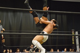大鷲ブレーンバスター、岩崎着地。大鷲ラリアット、岩崎かわしてバックドロップ(左写真)、松永にタッチ。