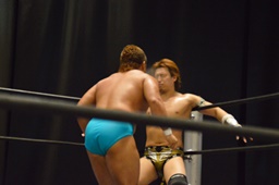 岩崎高木にガットショット、エルボー、ロープに飛ぶ、高木追走してサンシローズライン(左写真)。