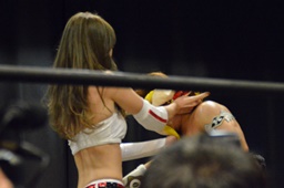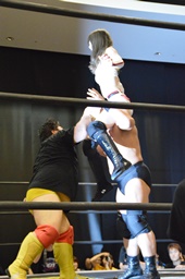 T2ひーはトリプルドロップキック狙うが伊橋が入って赤井を守る(右写真)。