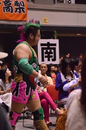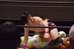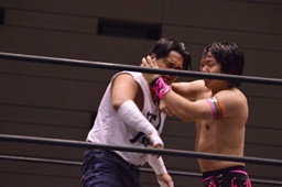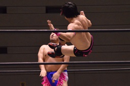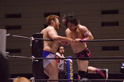高尾がディーノのボディにエルボー(左写真)、ドロップキック、カウント2。石井にタッチ。