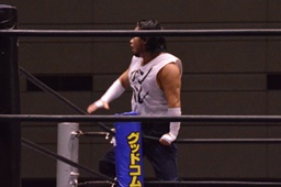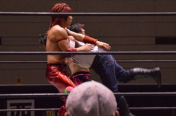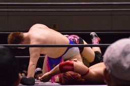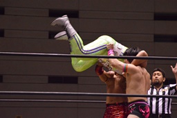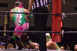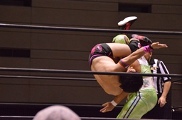 石井コーナーに振る、ディーノ切り返して突っ込む、石井ジャンプしてかわすとバック取って投げっ放しジャーマン(右写真)。