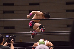 ディーノがリングイン。石井ボディスラム、高尾がディーノにトップロープ越えフットスタンプ(右写真)。