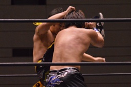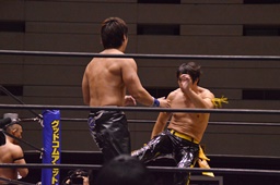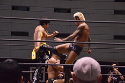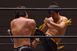 先発はHARASHIMAとKUDO(右写真)。HARASHIMAローキック、KUDOもローキック。