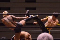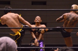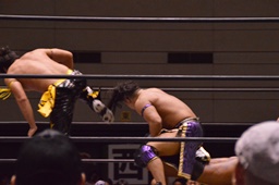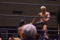 ロープに振ってダブルのミドルキック(右写真)。首投げからサッカーボールキック、カウント2。坂口にタッチ。
