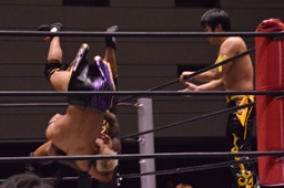 HARASHIMAフロントネックロック(左写真)、KUDO足をすくってケサ固めに、HARASHIMAヘッドシザーズで返す、KUDO外す。両軍タッチ。