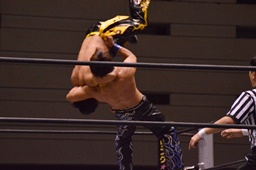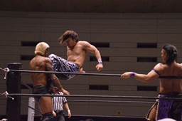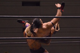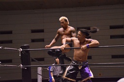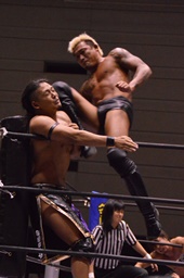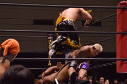 変形みちのくドライバーII(左写真)、KUDOがカット。HARASHIMAがKUDOを場外に落としてプランチャ。