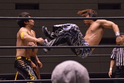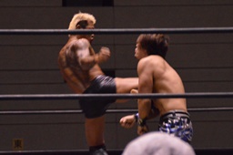 エルボー打ち合い、KUDOロープに飛ぶ、彰人キャッチして水車落とし、HARASHIMAにタッチ。HARASHIMAビッグブーツ、正面跳びドロップキック(右写真)。