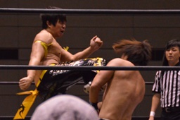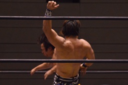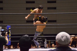 坂口ジャンピングミドル(右写真)、カウント2。HARASHIMAは彰人にタッチ。