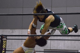 中津ロープに振る、佐々木切り返してヒップトス(右写真)、ロープに飛ぶ、中津リープフロッグからドロップキック。