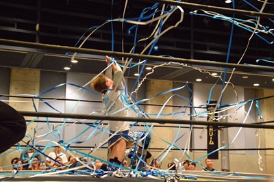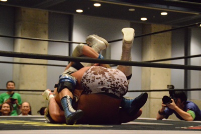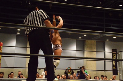 大石キャメルクラッチに(左写真)、ライアンロープ。場外に。