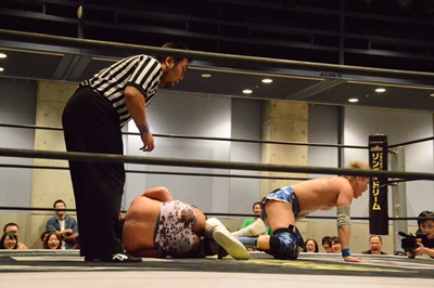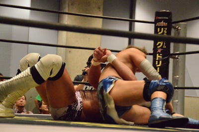 フライングメイヤーからグラウンドヘッドロック(左写真)、ライアンヘッドシザーズでブレーク。