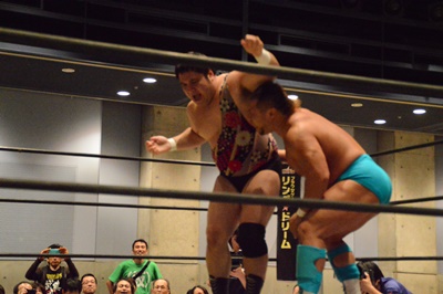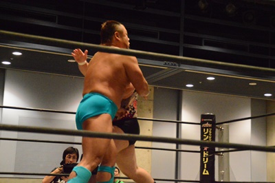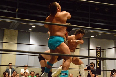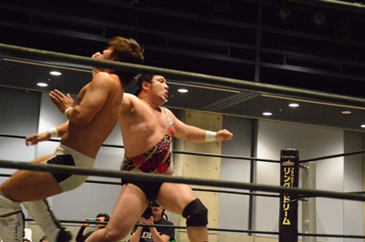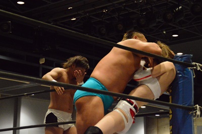 アントンロープに飛ぶ、松永が場外から足引っ張る(左写真)。