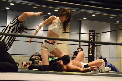 ニードロップからそのままヒザでフォール(右写真)、カウント2。