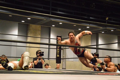 赤井がコーナーから松永にダイビングクロスボディ(左写真)。