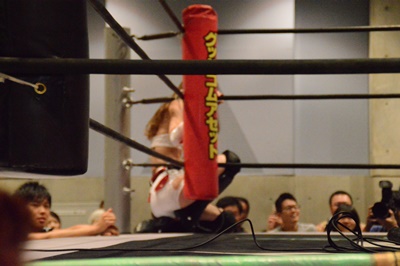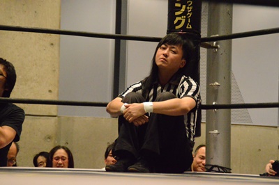 木曽レフェリーはコーナーで体育座り(左写真)。