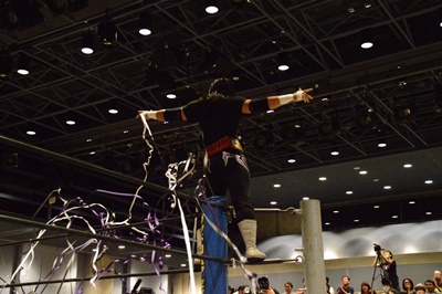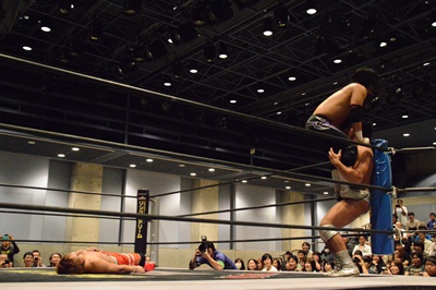 佐々木コーナーに上ってダイビングクローズライン、ロープに振ってケブラドーラ・コン・ヒーロ(左写真)。