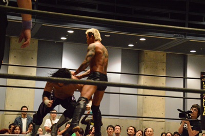 佐々木コーナーに振って串刺しエルボー(左写真)。