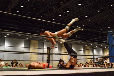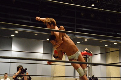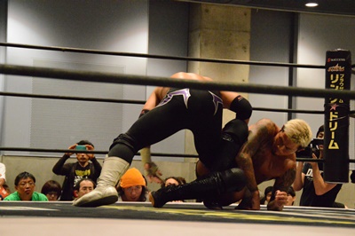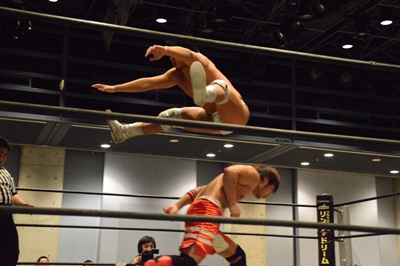 中津コーナーに振って突っ込む、宮武かわして肩に担ぐとバックフリップ(右写真)、ようやく佐々木にタッチ。