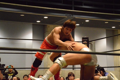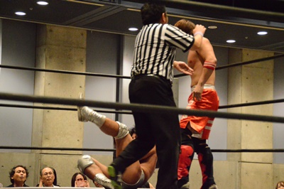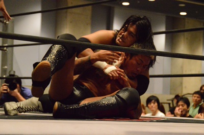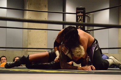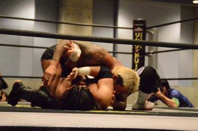 坂口フロントネックロック(右写真)からヒザ蹴り、中津にタッチ。