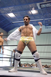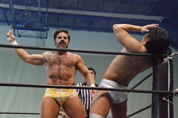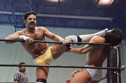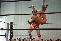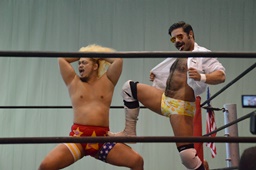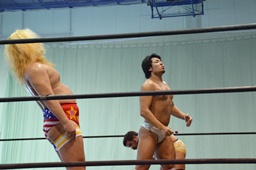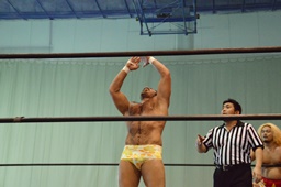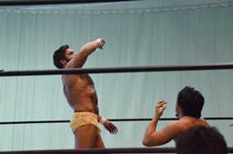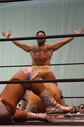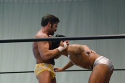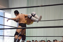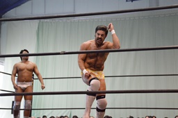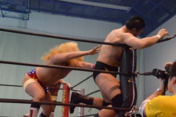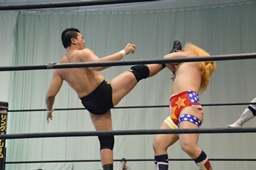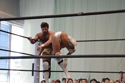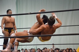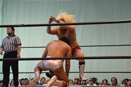 福田を担ぎ上げてオクラホマスタンピード狙うが福田は背後に着地して逆にターンバックルにぶつける(右写真)。ライアンにタッチ。